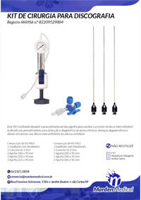 Este Kit é utilizado durante o procedimento de discografia para avaliar a pressão do disco intervertebral. Indicado em procedimentos para detecção e diagnóstico de dores crônicas, doenças degenerativas e danos estruturais nos discos intervertebrais da coluna vertebral.